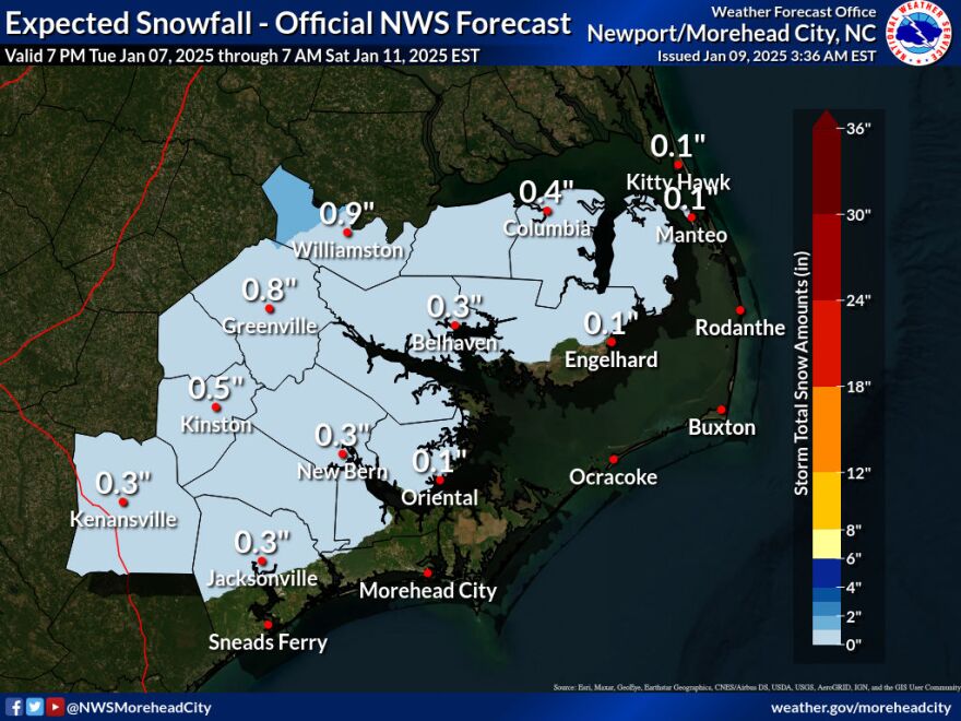 Martin, Pitt, Greene, and Lenoir Counties have the greatest chance of ice and snow accumulations in addition to a widespread half-inch of rain.