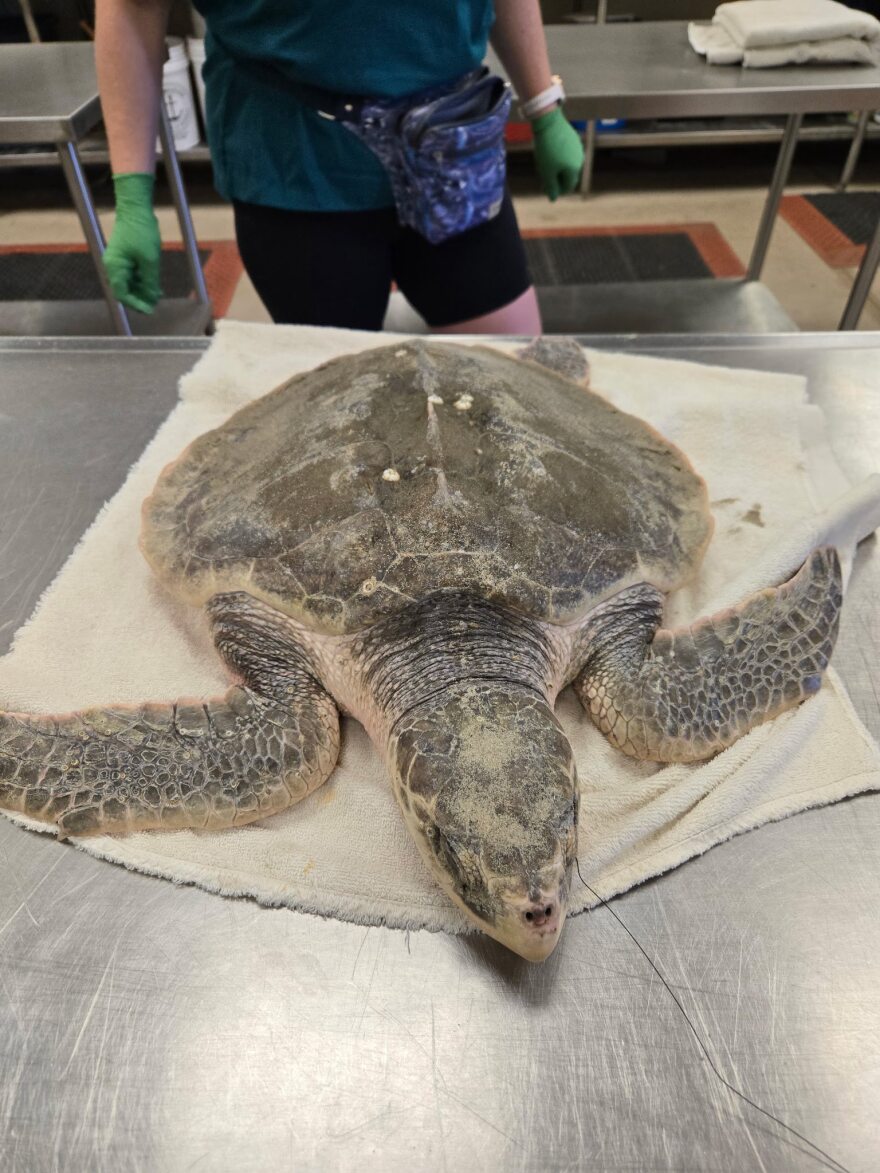 Shortly after, a large Kemp’s Ridley turtle was reported by a local fisherman after it accidentally swallowed a hook at the pier. Emerald Isle Police officers joined volunteers and pier staff to safely load the turtle for transport, where veterinarians were waiting to perform X-rays and remove the hook.