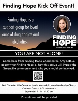 This is a kickoff meeting for a new support group for family members and friends who have loved ones battling an addiction. It is called Finding Hope (https://hopeisalive.net/what-we-do/finding-hope/). The kickoff is open to all (family members, friends, persons with addictions, substance use and mental health professionals, and concerned community members) who want to learn more about the Finding Hope family support group.