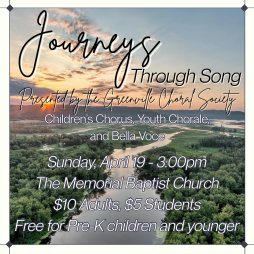 Greenville Choral Society’s Children’s Chorus, Youth Chorale, and Bella Voce are excited to present “Journeys Through Song”, coming up on Sunday, April 19 at 3:00pm! We can’t wait to see all of our students’ hard work pay off - we hope you will join us!