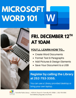 Learn the basics of formatting Word documents on Friday, December 12th at 10am. In this class, you'll learn how to create Word documents, format text and paragraphs, add pictures and design elements, and save your document to your computer or a USB.