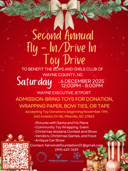We will have popcorn, cotton candy, hot chocolate, pictures and story-time with Santa, Christmas music and movies, as well as an antique car show and airplane decorating contest! Be prepared to help us wrap all the gifts!