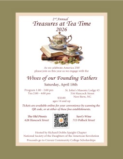 Treasures at Tea Time is an event that aims to teach about life in the Revolutionary War era; this is the second annual tea. The program starts with presentations by five women important in that time and afterward. Members of the Richard Dobbs Spaight Chapter Daughters of the American Revolution take on the characters of these women (including period dress) to share details about their lives and the impact they had on history. Women that will be portrayed are Martha Washington, Abigail Adams, Dolly Madison, Rebecca Sherman and Lucy Knox. After the program, tea will be served as it was in colonial times: tea sandwiches, something savory, and something sweet. All proceeds will be used to fund scholarships for Craven Community College students.