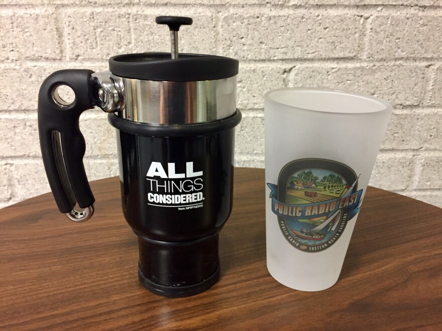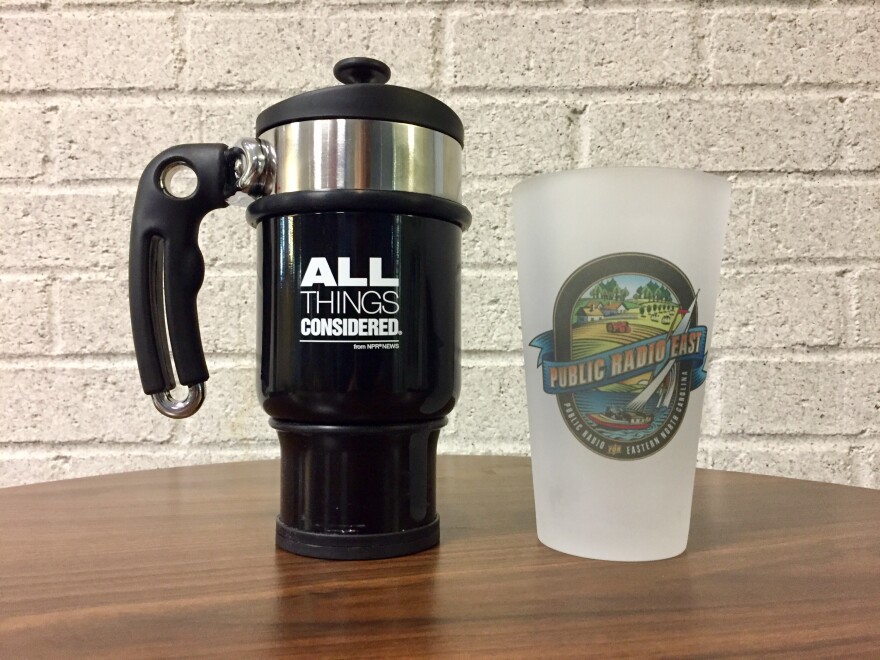 Support public radio in eastern North Carolina with a pledge of $75 and pick up the PRE frosted pint glass with the four color logo for your favorite beverage. Pledge $125 for two glasses and $240 for four 16 oz. glasses. Also available for your pledge at the $180, the new 14 oz double shot French press travel mug with both Morning Edition and All Things Considered logos. Constructed of double-wall restaurant grade stainless steel, this mobile French press comes with a patented plunger and stainless steel mesh screen. The built in carabineer makes it easy to attach to a backpack when you're on the go. Store fresh coffee in the screw-in canister on the bottom. Make a secure online pledge or call 1-800-222-9832. Thank you!